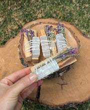 Elevate your spiritual journey with our Palo Santo & Selenite Smudge. This beautifully wrapped bundle features the sacred Palo Santo wood, dried flowers, and the purifying properties of selenite crystal. Light this smudge to purify and uplift your environment, fostering a sense of calm and clarity.